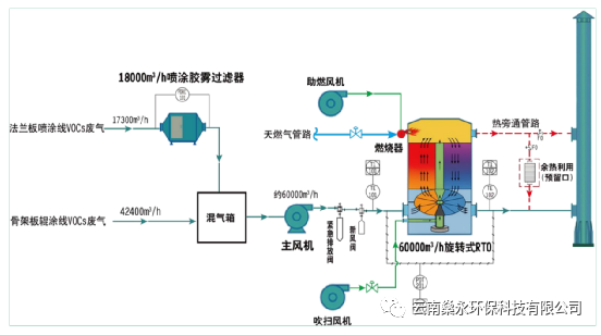 3/h进行设计(RTO运行负荷: 30%- - 100%任意区间均能稳定运行)。2、针对法兰板喷涂线废气先进入胶雾过滤器再进RTO进行处理。总风量为17300m