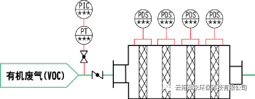 法兰板喷涂线废气含有炭黑尘,直接进入RTO炉会导致炉内蓄热陶瓷堵塞,故选择前端进行除尘处理,除尘采用喷涂胶雾过滤器。该喷涂胶雾过滤器的设备主体结构金属材料为Q235冷轧钢板及以上性能金属材料,过滤器过滤等级分别为 G4、F3、F5、F7,不同等级过滤器为模块化设计,组装方便。在过滤器前后设置在线压差变送器,保证废气处理系统正常、安全、稳定运行。当过滤系统压力达到设定报警值时,报警系统发出报警信号,报警信号接入中央控制室,提醒操作人员更换滤材。