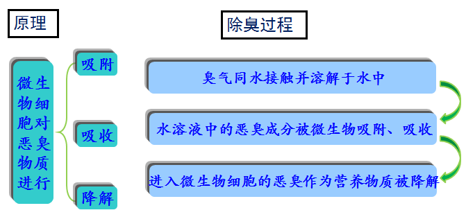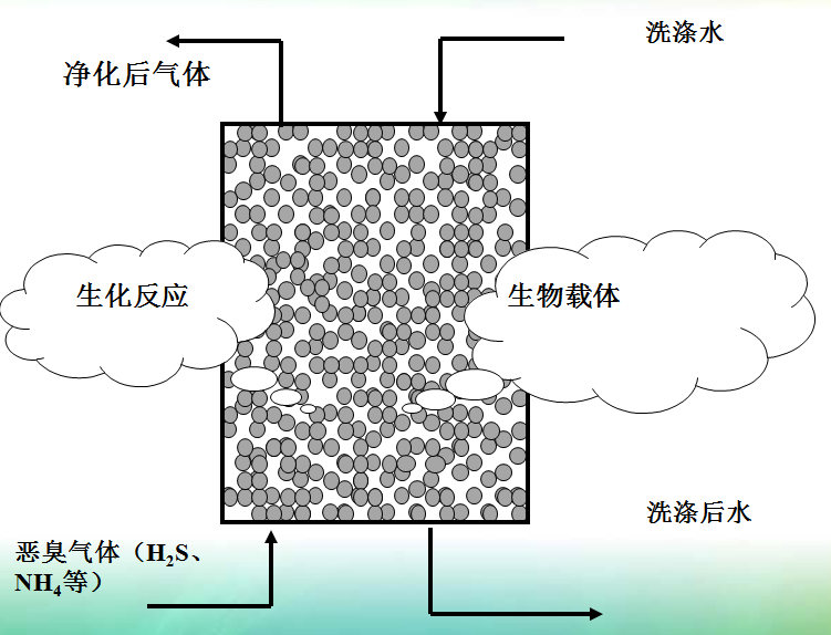 各支管收集后的恶臭气体汇集至主管中,经引风机送至洗涤塔,在预洗涤塔内,恶臭气体与雾化工艺水逆流接触,去除部分粉尘,易溶、可溶性物质,并被加湿后进入生物滤床通过微生物对恶臭物质吸附、吸收后通过自身的新陈代谢作用把恶臭物质转化为自身的细胞成分,从而促进微生物本身繁衍、生长的过程。除臭气体最后通过烟囱达标排放。