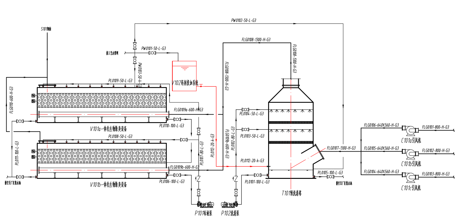 为满足日趋严格的环保要求,选择处理技术成熟、效果好、投资省、运行费用低的预洗涤+生物过滤处理工艺,该工艺运行稳定可靠,可调节性强,操作管理方便并最大限度地避免二次污染。