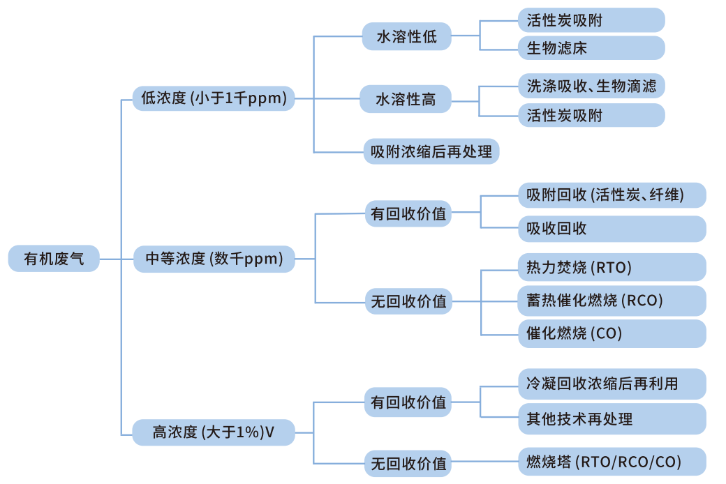 由于VOCs污染排放的复杂性,多数情况下采用单一的治理技术往往难以达到治理要求,在经济上也是不合理的,需要采用多技术组合进行治理。 VOCs治理技术体系: