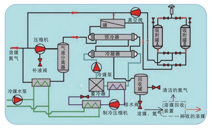 含溶媒的工艺尾气通过压缩机加压提高冷凝效率,高压气体进入冷凝器进行冷凝,此时溶媒在冷凝器中的气体分压超过其相应的饱和蒸汽分压,发生相变冷凝为液态溶媒回收利用,未冷凝的气体经过预冷器进入膜组件,透过膜组件的富含溶媒的气体返回到压缩机入口迭代处理。含微量溶媒的透余气可以根据工艺需求回设备循环使用(实现零排放)或进入吸附装置,经过吸附尾气可以达标排放,吸附装置的解析气通过真空返回压缩机入口迭代处理。