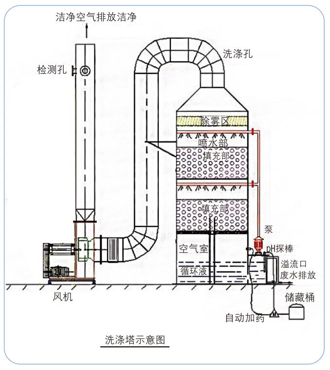 (3)水洗只能去除可溶或部分微溶于水的恶 臭物质,如氨等;酸洗可去除氨和胺类等碱性恶 臭物质;碱洗则适于去除硫化氢、低级脂肪酸等 酸性恶臭物质,为达到综合治理,多采用酸洗与 碱洗串联使用。