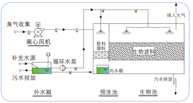 生物除臭法是通过将经驯化的微生物承载在一定比例配制的活性介质(填料)上,利用微生物的生理代谢活动将具有臭味的物质加以转化,达到除臭的目的。